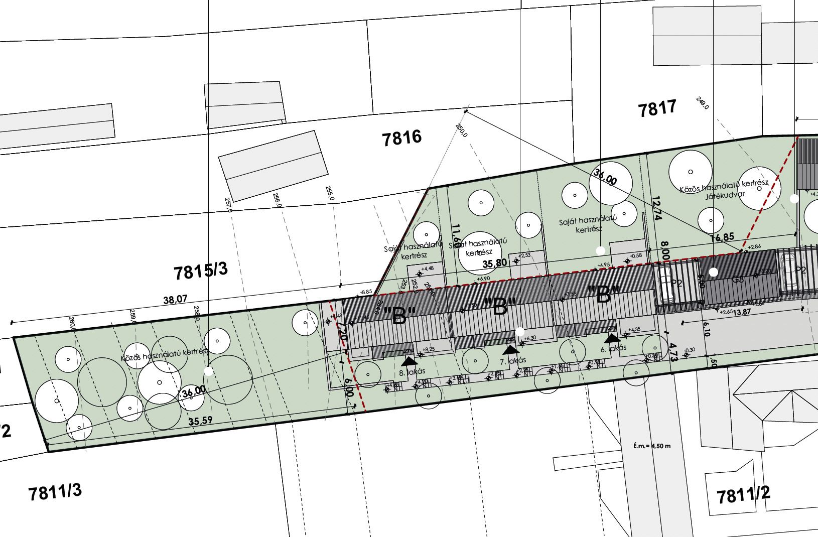 - 5 ház (A typus) 4 szobával, átriummal, garázzsal és kocsibeállóval kapcsolódik.